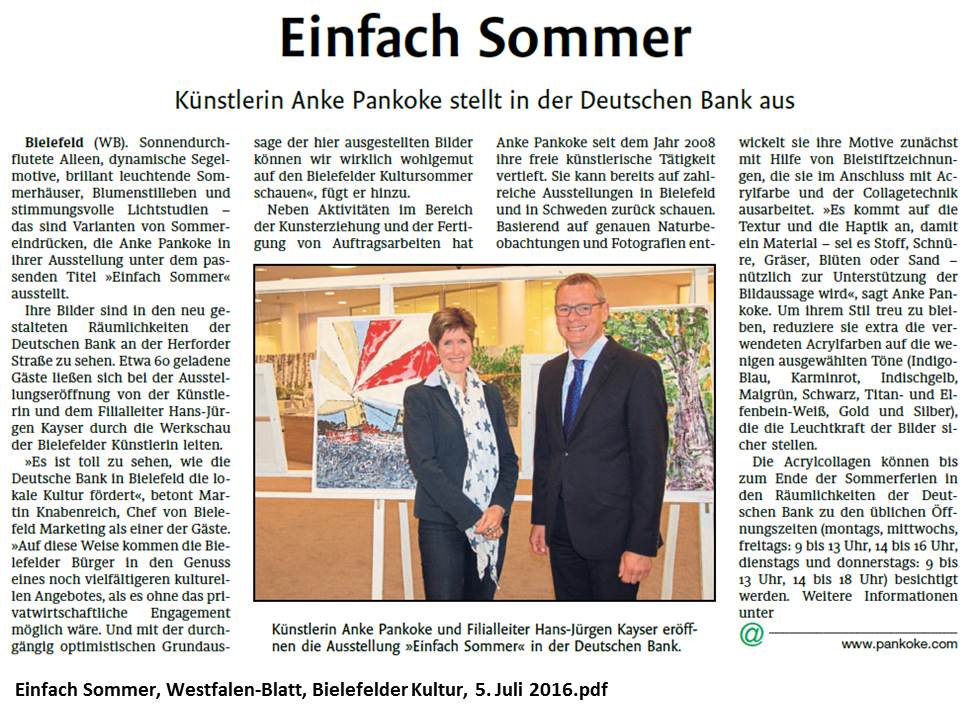 Die Arbeiten von Anke Pankoke waren in den vergangenen Jahren in zahlreichen Ausstellungen zu sehen. Über die unten angehängten Schnappschüsse können Sie diese noch einmal Revue passieren lassen. Die Bildkataloge und Preislisten geben einen Überblick über die jeweils präsentierten Bilder.