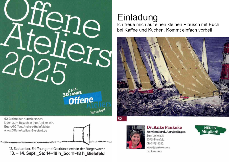 Sie sind jederzeit herzlich eingeladen, einen Termin in Anke Pankokes Atlier in Bielefeld zu machen, um die Bilder unabhängig von Ausstellungen anzuschauen und zu erwerben.